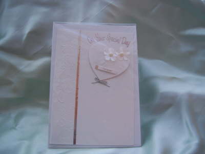 White card with embossing down the side, silver strip down side and with white heart and pearls.
